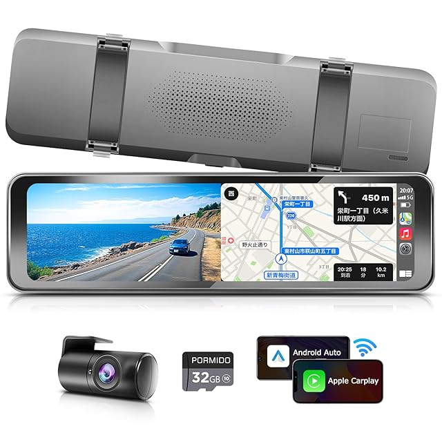 PORMIDO ポーミド 【ワイヤレスCarplay/AndroidAuto搭載】ドライブレコーダー ミラー型 リアカメラのみ後方フォロー特化1080P録画【後カメラズーム機能】11インチデジタルインナーミラー/カーナビ一体型ドラレコ WDR対応 光の反射対策 Gセンサー 地デジ対策済 駐車監視 GPS機能 バック連動対応 リアカメラ室内専用 32GBカード同梱【PRD63C】【技適取得済み】
