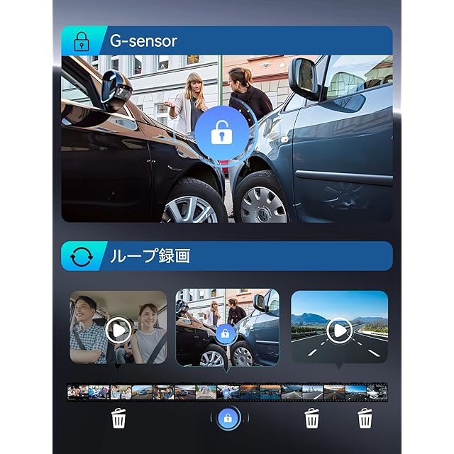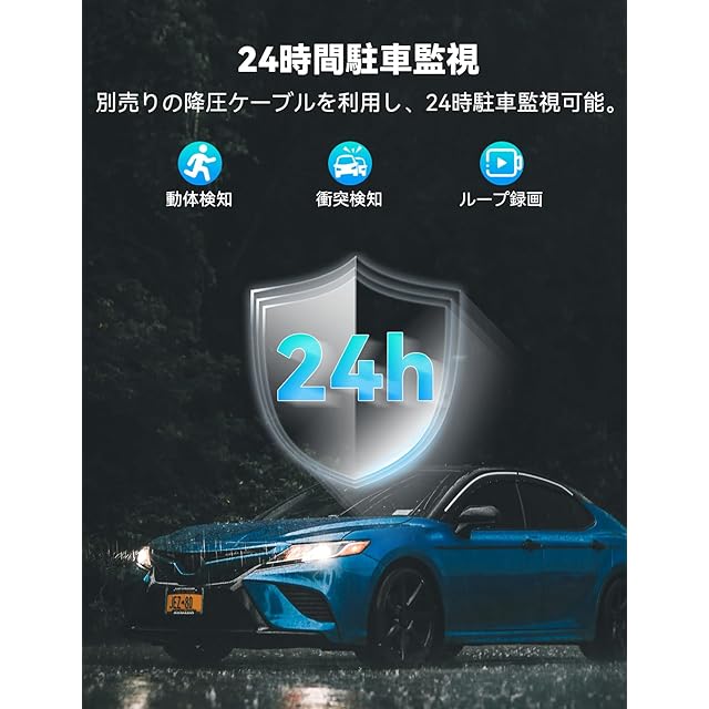 【G-sensor&緊急録画&24時間駐車監視】このドライブレコーダーはGセンサー機能があり、事故や衝突で車両が揺れたときは、自動的に緊急録画を入り、録画ファイルが自動ロックされるので上書きされません。これにより、事故の原因を調べる際に重要な情報となります。M CARKUMIドライブレコーダー前後カメラは駐車監視ケーブルを利用すれば、最大24時間の映像を記録できる「駐車監視機能」も利用できます。24時間365日監視対応できるため、万が一の当て逃げ被害にも対策できるでしょう。(ご注意:ドライブレコーダーの駐車監視機能を使用するには別売りの駐車監視ケーブルが必要です。)