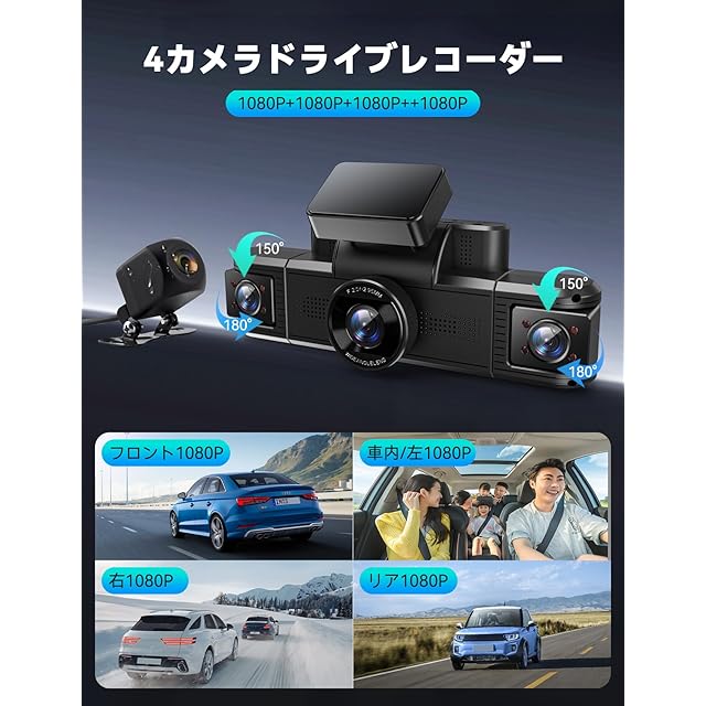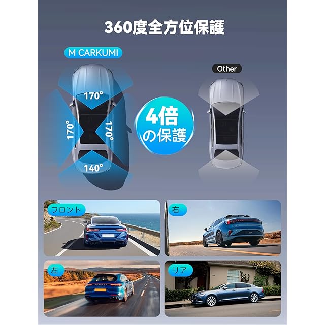 【3月7日追記】6月30日前、当商品カメラのバージョンは四つの1080Pです。ご了承ください。 【4カメラドライブレコーダー 前後左右同時録画360度全方位監視 】M CARKUMIドライブレコーダーは最新のイメージセンサーV553を搭載により、前後左右にクリアな映像を撮影します。同時に、前方車や道路、信号機など周囲の状況をくっきりと記録します。フロント170°、左170°、右170°、リア140°の広角レンズの採用によって死角少なく360度によく近い全方位の画角で撮影できます。左右カメラは180°回転できて、車内カメラとしてもご利用いただけます。リアカメラのケーブルの長さは6メートルで、車両と配線方法に基づいて延長ケーブルが必要かどうかをご確認ください。