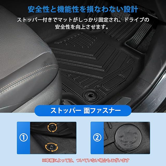 【安全性と機能性を考えた設計】:フロアマットは、どの製品を選ぶ際でも、床にしっかり固定できることが大切です。本製品には、安全性と機能性を重視した様々な加工を施しております。足元の滑りを防ぐ、マットの裏面に「安心」なずれ防止加工が施されております。また、専用固定フックがあるので全然前後にもズレなく、安全に快適にご使用頂けます。※車種によっては、ついていない場合もございます。