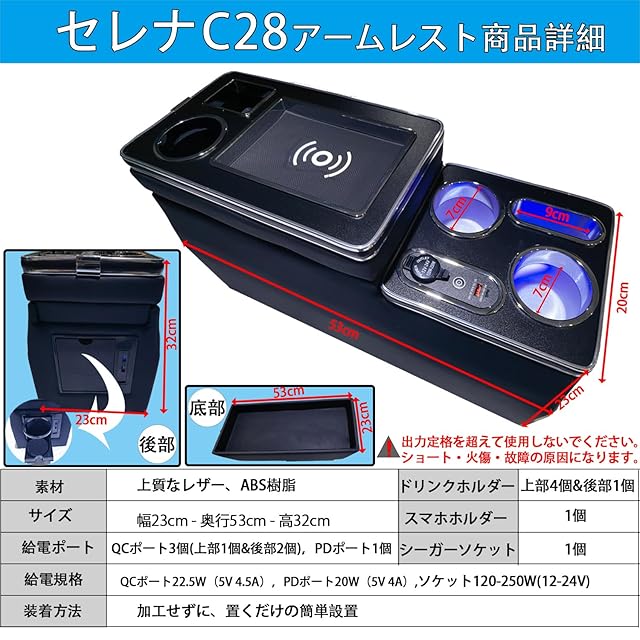 【ワイヤレス充電&急速充電】セレナc28 e-POWERアームレストはワイヤレス充電規格「Qi」に対応できます。【Qi対応の機種】iPhone 8以降のすべての機種に対応。※iPhone 7前の機種は非対応。Pixel3、4、5、6 Xperia 1 II、XZ2、XZ3、AQUOS R3、Galaxy S8、S9、 S10など。最大10Wの高出力ワイヤレス充電に対応し、従来と比較して約2倍の速さで充電ができるのです。またtype-c 20W 1ポートを追加、アップグレードされたUSB QC3.0 3ポート(前席:1ポート 後席:2ポート)を増設、デバイスの充電が高速かつ効率的に行えます。後部座席の乗客にも便利になります。
