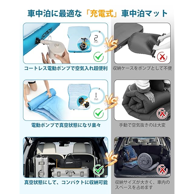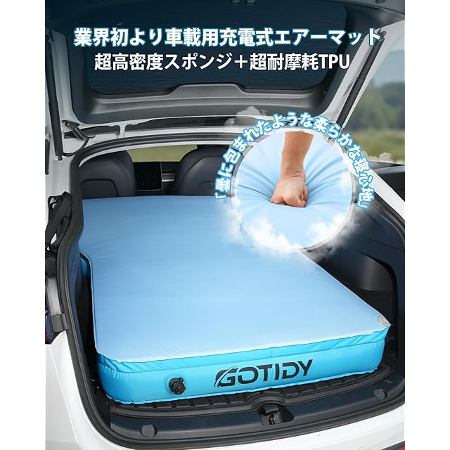 【革新的な車中泊マット】車中泊の際、自宅と同じくらい快適な睡眠を望みませんか?車中泊マットが硬すぎたり柔らかすぎて腰痛や背中の痛みを心配することはありませんか?業界初の充電式GOTIDY車載用電動エアーマットが登場します。エアーマットの内部には、独特な空気柱と表面の高反発特性を持つ形状記憶スポンジが組み合わされており、エアーマットレスの柔らかさとしっかりしたサポート力を感じることができます。雲のような快適さを楽しむことができます。柔らかな雲に包まれたような寝心地は、安らかな夢の世界へと導かれます。不眠症の恐れに苦しむことは解消されます。