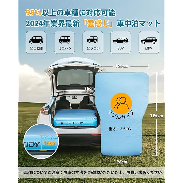 【多車種対応設計】自動車の中で快適に寝るのに役立つ車中泊用マットをお探しですか?車内のシートを全部寝かせても、凹凸や斜めになるため完全にフラットになる車種は多くありません。そんなときに便利なのが「車中泊用マット」です。SUV・軽自動車・ミニバンなど95%以上の車種に対応可能で、寝かせたシートの上に設置することで、凸凹や隙間の空間を埋めてくれます。また、表面の超高密度スポンジで適度な厚みと優れたクッション性があるので、自宅用ベッドの寝心地ような使えるので、観光や趣味などで車中泊旅行をするときも、ぐっすり眠れて翌日も思い切り楽しめます。高級感のあるデザインを採用されるGOTIDY「雲感じ」車中泊マット、ラグジュアリーな雰囲気にあふれており、全く異なる車中泊体験を提供します。※ご注意:お車の寸法をご確認いただいた上、お買い求めください。もし車種の適用性についてご不明な点がございましたら、どうぞご遠慮なくお問い合わせください。