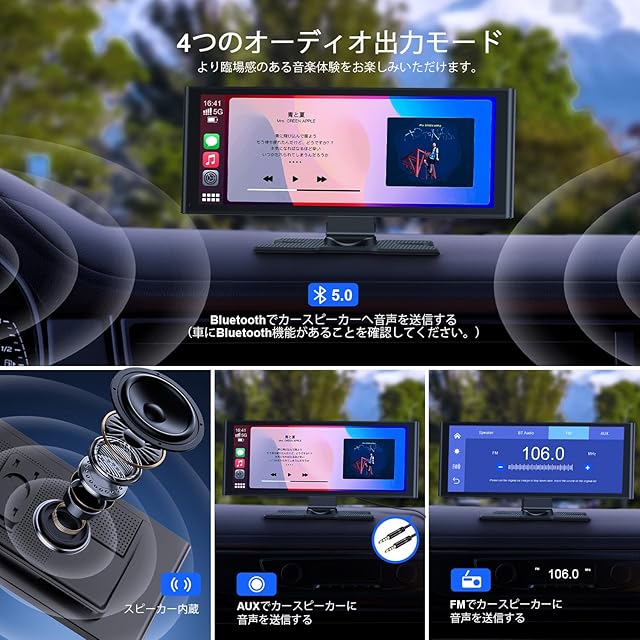 【4種類のオーディオ出力】内蔵スピーカーを通じてオーディオを出力できるだけでなく、アップルカープレイやアンドロイドオートに接続すると、BluetoothまたはFM周波数同期を介して車のスピーカーにワイヤレスでオーディオを送信でき、より大きく、クリアな音質を実現します。さらに、付属のAUXケーブルを使用して車のAUX入力ジャックに接続することで、さらに高品質でロスレスなオーディオ体験が可能です。