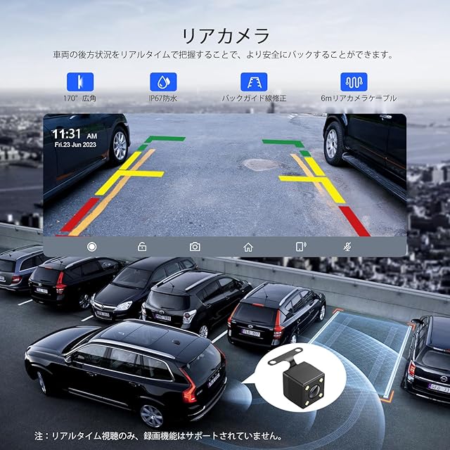 【リアカメラ付き&リバースアシスト】弊店のワイヤレスカープレイモニターは、高解像度とIP67の防水性能を備えているリアカメラ(ケーブル長さ:6m)が搭載されており、バック操作がより簡単に行えます。赤いワイヤーをリバースライトに接続するだけで、バック時に画面に自動的にリバース画像が表示されます。(※リアルタイム後方画面視聴とバックアシスト機能のみ対応、録画機能はサポートしておりません。)ご注意:後方カメラをご使用の際は、カメラの取り付け位置の固定状態と角度を必ず確認してください。また、リバースアシスト機能を設定する際は、予めガイドラインの校正を完了させてください。
