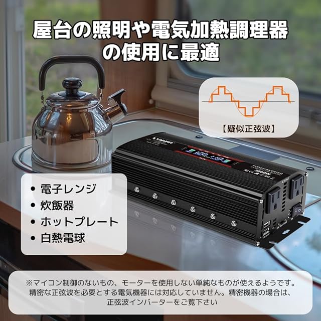 【注意③】家電製品を使用する場合、電化製品の消費電力に合わせた容量のインバーターの使用が必要です。詳細は商品ページ下の商品説明と画像をご参考くださいませ。
