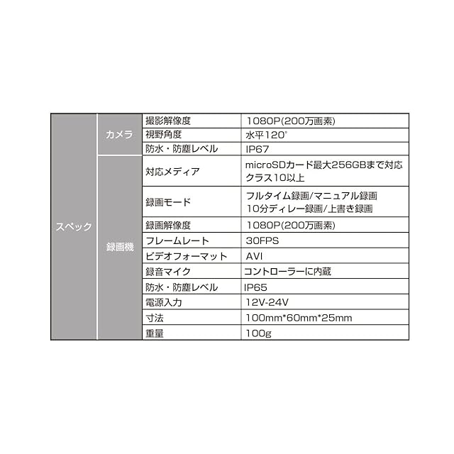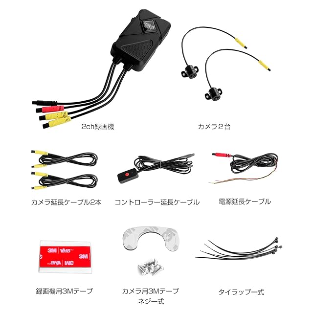 ●配線が簡単:電源の配線は非常に簡単。電源延長ケーブルをヒューズボックスの+とアクセサリー電源に接続するだけ。配線が苦手な方はバイク販売店などにご相談ください。●設置が簡単:本体のサイズは、縦100mm、横60mm、厚み25mmです。非常に小型ですので車体の収納ボックス(シート下)など設置する場所には困りません。●どんな車種にも対応:12V-24V入力に対応します。付属の電源ケーブルは160cm、コントローラーケーブルは260cm、カメラケーブルは540cmです。どんな車種の取り付けにもじゅうぶんな長さです。●セット内容:2ch録画機、カメラ×2、カメラ延長ケーブル×2、コントローラー延長ケーブル、電源延長ケーブル、タイラップ一式、録画機用3Mテープ、カメラ用3Mテープ、ネジ一式