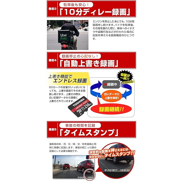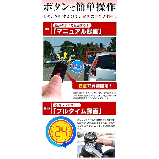 ●SDカード録画:256GBのカードを利用すれば、カメラ2台で最大約14時間の連続録画をすることが出来ます。ツーリング旅行など長時間のドライブでも安心です。●マニュアル録画:ボタンを押すだけで、録画の開始と停止。●フルタイム録画:エンジンをかけると自動的に録画を開始。いったん録画が始まれば、走行中でも停止中でも連続で録画し続けます。●10分ディレー録画:バイクを駐車後、エンジンを停止したあとでも、10分間監視録画をし続けます。●上書き録画、タイムスタンプ