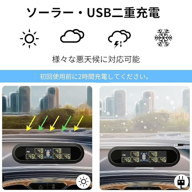 【ソーラー&USB二重充電】タイヤモニター の本体はソーラーパネルとUSB充電ポートを搭載し、普段はusb充電が主で、太陽光で充電を補助することもでき、エネルギーを節約します。※ご注意:初回使用前に3時間充電してください。気温(低温)や天候(曇天)の影響でモニターの稼働時間が短縮する場合もございます。