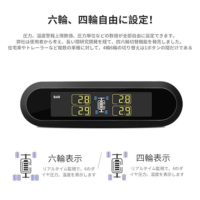 【tpms 6輪】空気圧モニター 6輪 は圧力単位が二つある「PSI,BAR」と二つの温度単位「℃、 ℉」が選択できます。トラック、トレーラー、キャンピングカー、SUV、ORV、 MPV ほとんどの車に対応できます。万が一商品に不具合があった場合やご対応いただけなかった場合、ご遠慮なくお問い合わせください。通常24時間以内対応させていただきます。