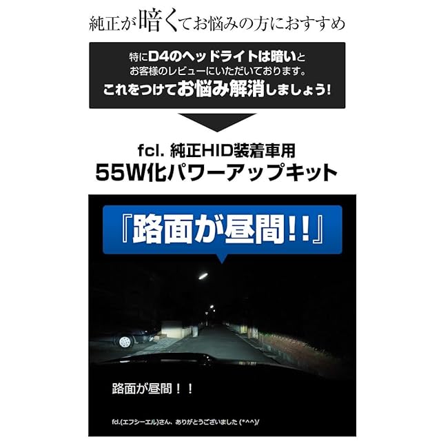【純正HID車も55W化で圧倒的な明るさへ】「純正HIDの明るさに物足りなさを感じている」「もっと存在感のあるクールな光にしたい」――そんな方におすすめなのが、エフシーエルの55Wパワーアップキットです。このキットを装着することで、純正HID車でも55W化が可能になり、ルーメン数が大幅にアップ。夜間の走行時も圧倒的な明るさで視界が広がり、運転の疲れを軽減します。