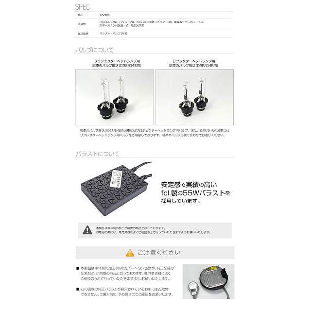 【1年保証「期間中何度でも」& 車検対応 】…こちらの商品は、色味 ・カットラインなどを含め国内の車検基準を満たす【車検対応の製品設計】です。さらにfclでは、保証期間内(1年)は【全パーツを保証対象】とし【期間中は何度でも】ご交換や検査を実施し、安心の体制を整えています。弊社では、国内の専門機関による車検基準を満たすカットラインやルーメン数などの検査、出荷前には実際にバルブを検査し、車検基準である色味かどうかも確認しています。※フロスティブルーは除く。保証対応に関しても、他社の長期保証には期間中の交換は【1回だけ】と回数が制限されている保証や、商品セットの中で一部パーツのみ保証期間が短いといったケースもありますが弊社では万が一保証期間中に2度目の不具合が行った場合でも【何度でも】保証対応を行っております。商品に不備がある場合、【往復分の送料】も負担しており、サポートは国内の専門スタッフが対応しておりますので万が一の故障やお困りの際には弊社カスタマーサポートまで直接ご連絡ください。