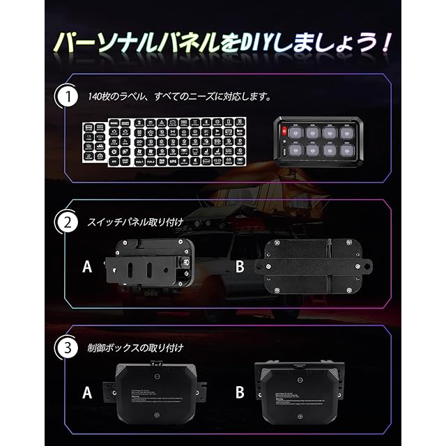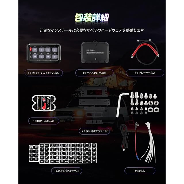 「80A回線保護」-8組のスイッチパネルには固体リレーが内蔵されており、13個の出力を搭載している:3個の定格値@10A、3個の定格値@15A、3個の定格値@20A、4個の定格値@30A。過電圧保護、反極性保護、過電流保護、熱保護を提供し、接続されているすべてのLEDライトとアクセサリを安全に動作させます