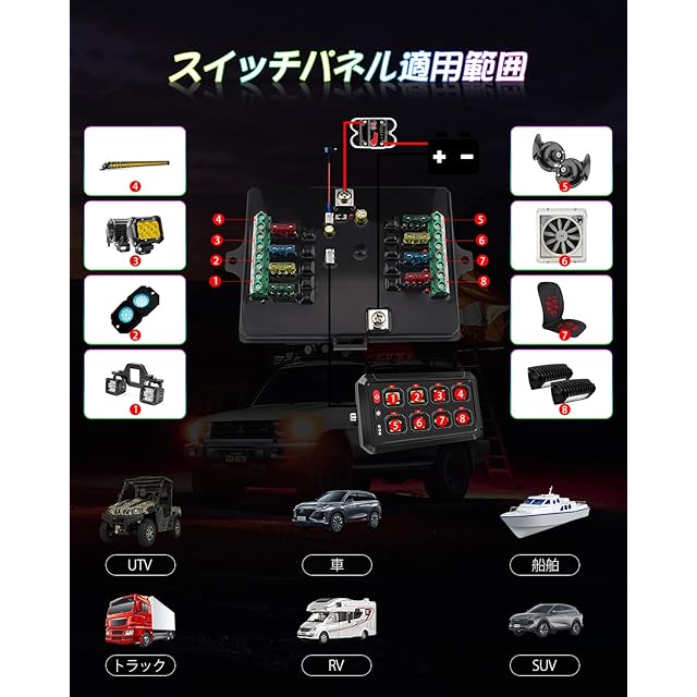 「多機能選択可能」-3つのシリカゲルボタンをアップグレードし、ledランプをフラッシュランプ、安定点灯またはラッパを瞬時スイッチに変えることができます。メモリ機能ON/OFFスイッチに付き、8列マルチランプコントローラは専門品質の配電システムと配電盤であり、クロスカントリートラック船用UTV ATV RVなどの車両に設計されている