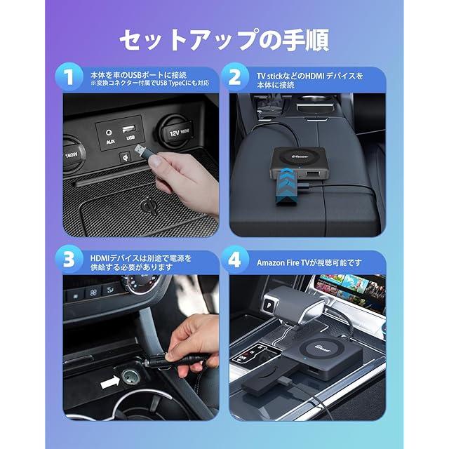 【かんたんセットアップ】①本体を車のUSBポートに接続②TV stickなどのHDMI デバイスを本体に接続 ③HDMIデバイスは別途で電源を供給する必要があります。④本製品を接続した後、ホーム画面で「HDMI」をタップし、HDMIデバイスを本製品のHDMIポートに接続してください。お使いのスマートフォンのホットスポット機能を利用して、Fire TV Stickなどのコンテンツにインターネット接続を共有することで、車内でHDMI入力映像を視聴できます。また、車載Wi-Fiを使用することも可能です。※本製品はスマートフォンのテザリング機能を直接使用することはできませんので、ご了承ください。
