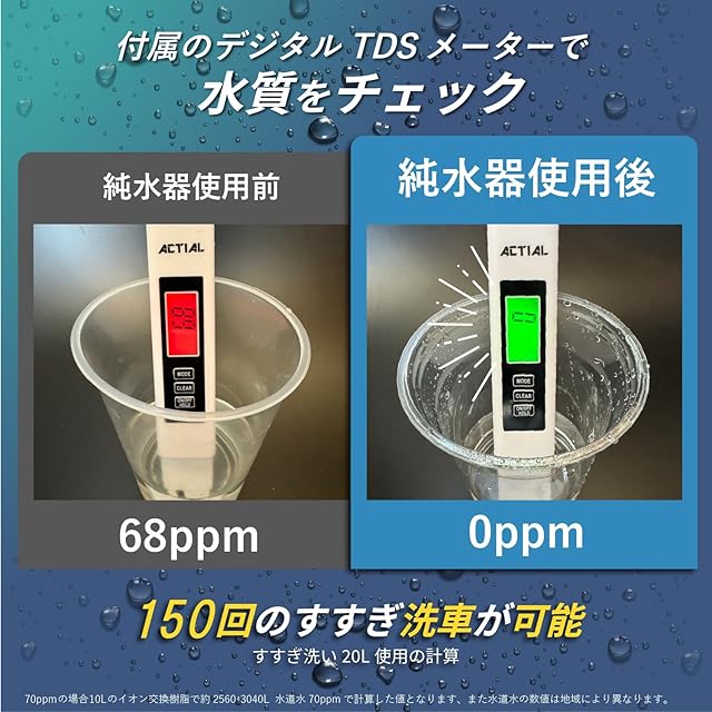 ACTIAL 純水器 イオン交換樹脂 洗車 10L TDSメーター 専用カバー付き 日本製 1年間保証付き 純水機