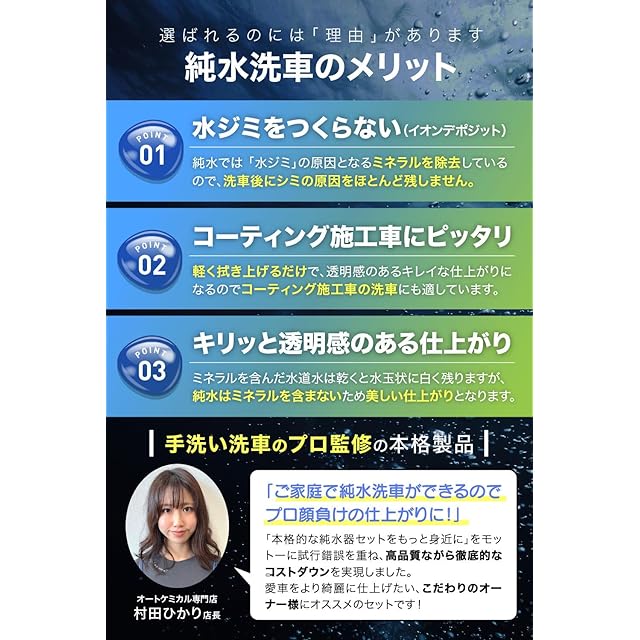 ✅イオン交換樹脂10Lの使用回数目安は濯ぎ洗いのみ純水の場合/約120回分、純水のみで洗車の場合/約20回分になります。純水器はイオン交換樹脂を使ってイオンを除去して、脱イオン水(純水)を作るものです。 愛車につく水ジミを圧倒的に少なく保つことができるようになります。 水ジミ(イオンデポジット)ができる理由は 「水道水に含まれるミネラル分」です。 洗車時に不純物(ミネラル分)を含まない純水を用いることで面倒なふき取りの手間を 省略し、水ジミ(イオンデポジット)の発生を防ぐことができますので時短にもとても有効的です✨