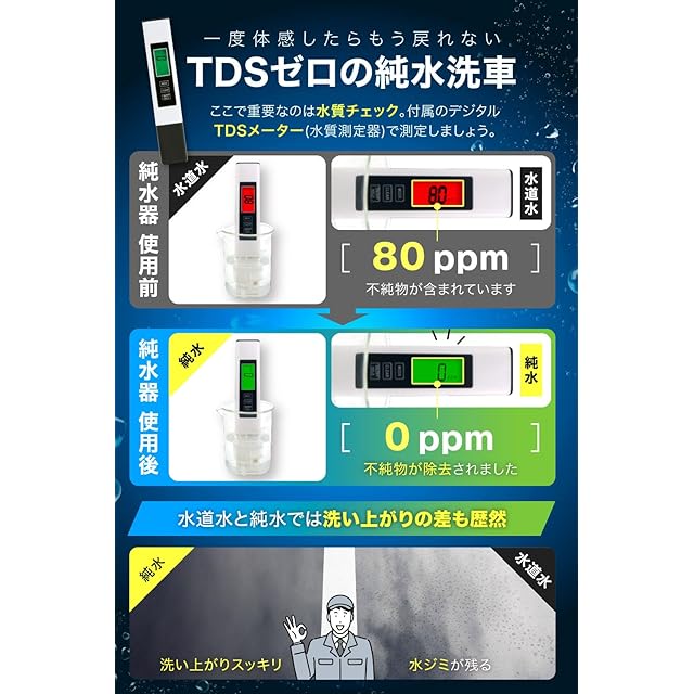 純水器切替ヘッドは別売りです。 こちらの商品は純水器+イオン交換樹脂10L (5L×2袋) セットになります。 ✅今まで本格的な純水器を欲しかったけど高額な為中々手が出ないという オーナー様の声に応えるべく 「より多くの洗車好きオーナー様にご自宅で、もっと身近に本格的な純水器をお楽しみ頂きたい」 をモットーに、高品質ながら徹底的なコストダウンを実現致しました✨