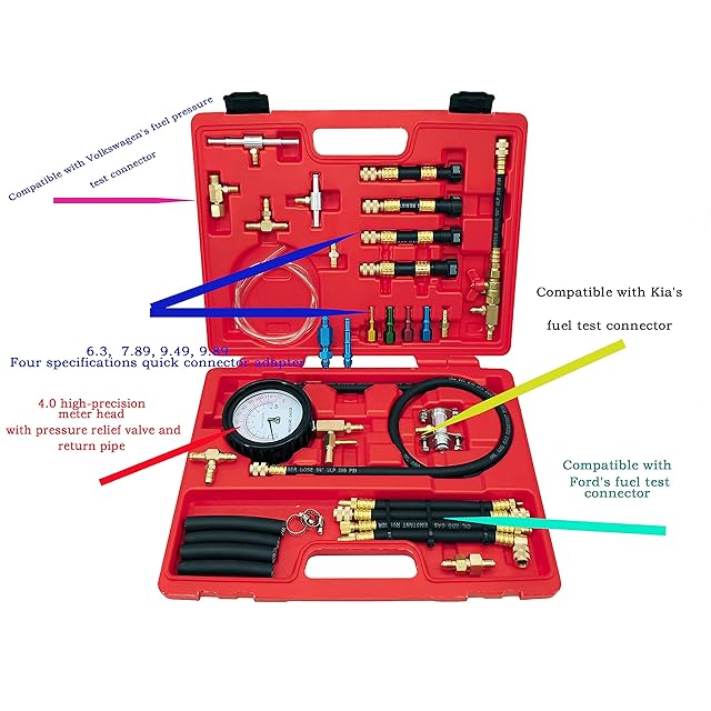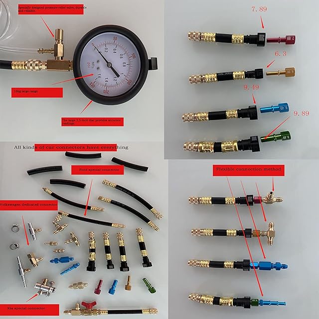 【特殊用途】ZKTOOL燃料噴射圧力テスターには、フォード用ホース付きフィッティングが4つ、キア用フィッティング1つ、フォルクスワーゲン用フィッティング1つ、燃料パイプクイックカップリングの仕様が4つ、さまざまなモデルのユニバーサルホースコネクターの仕様があります。