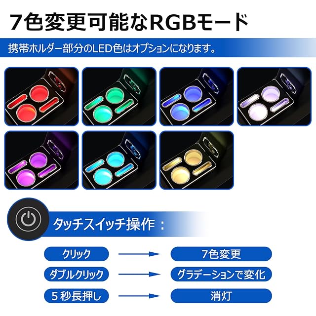 2.【RGB照明&操作方法】アームレストのドリンクホルダーと携帯ホルダーには、ボタン一つでお好みのカラーでライトアップする機能が搭載されています。毎日の気分に合わせて異なる色を点灯し、クリックして7種の色を変更できます。スイッチをダブルクリックするとグラデーション効果が楽しめ、スイッチを5秒長押しすることで消灯します。さらに、アームレストのフタを開けると、ブルーのライトが自動的に点灯しますので、夜に物を捜すことも楽になります。