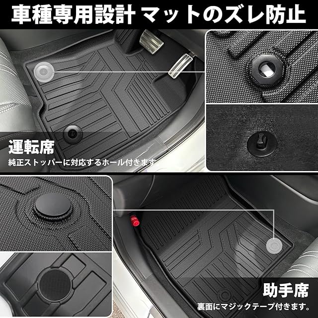 車種専用設計でピッタリフィット:ZRV フロアマットは■車種専用設計、マットのズレ防止。運転席は純正ストッパーに対応するホール付きます。それに、助手席は留め具裏面にはマジックテープ付きます。■アクセルペダルとブレーキペダルに干渉しません。■座席のスライドレールに干渉しません。抜群フィッティングします。こだわり車種専用設計のため、車内に隙間なくフィットします。