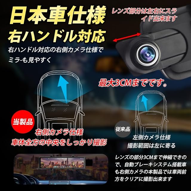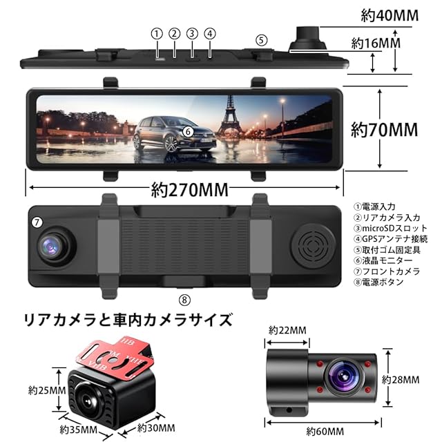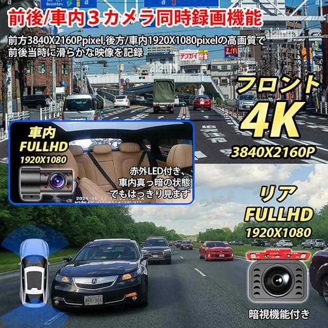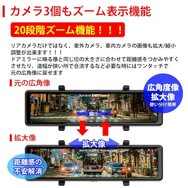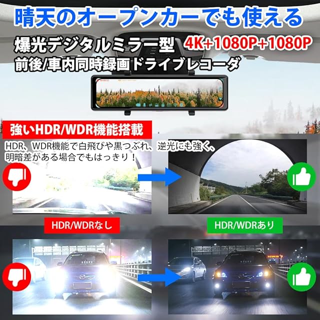 【4K超高画質+業界唯一の3かメラ搭載が新登場+ ミラー型ドライブレコーダー】4K人気のデジタルインナーミラー最新の進化です、4K2160Pの画質を保つ場合に、車内と車外1080Pカメラを追加して3かメラが同時撮影できます あらゆる視覚盲区を見逃さず、全方位角度を見渡せるようにする。バックカメラにはWDRで眩しい光抑制機能がありますので、フロントカメラよりも暗くなりますが、正常な状態でご心配しないでください、車内カメラ赤外線暗視機能、夜でもはっきり見えます、普通の車内カメラ進化しました。