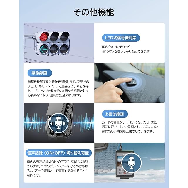 ✅【24時間駐車監視機能&自動ループ録画】 エンジンのON/OFFに連動して駐車監視モードへの切り替えを行います。 駐車監視中に動体を検知したり、衝撃を感知したりすると、自動的に録画を開始。★衝撃の前15後30秒間(計45秒間)の映像が保存されます。三つの録画モードが選択可能 「動体検知+衝撃検知」 駐車中に起こった衝撃を自動的に記録します。「タイムラプス(1/3/5/10FPS)+衝撃検知」コンマ単位の静止画を録画することで録画容量を節約します。「低ビットレート録画」常時録画+衝撃検知ビデオを低ビットレートで録画します。 本製品は業界唯一のロックファイル上書き機能を搭載しています。通常の録画(70%)とロック録画(30%)の2つのファイルがあります。ロックファイルと通常録画ファイルが別々で上書きします。★スーパーキャパシタ搭載:重大事故などで急に電源が断たれた場合、搭載された非常用電源を使用し、記録中の映像破損を防いで保存します。