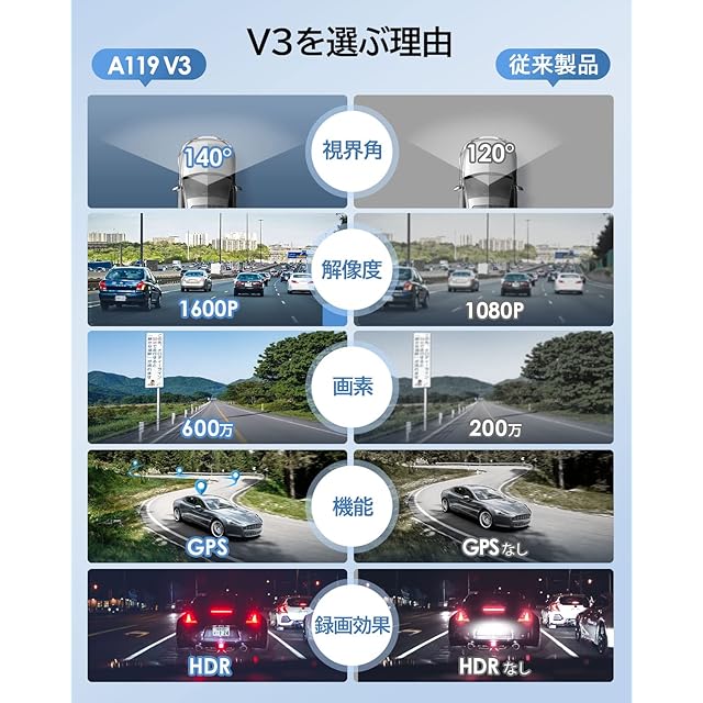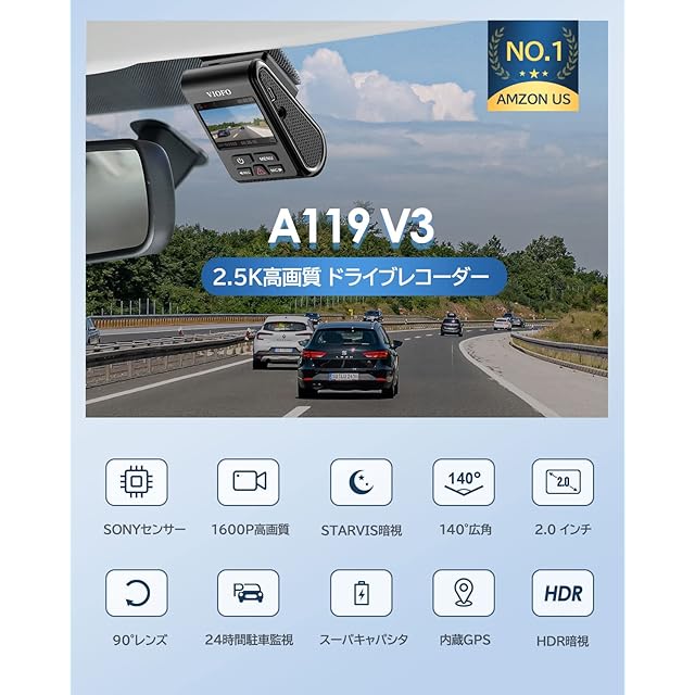 ドライブレコーダー 超小型カメラ 600万画素 2.7K GPS機能 車載カメラ フロント/リアとしても利用可能 HDR搭載 暗視機能 140度広角 LED信号機対策 車載カメラ 高耐久ドラレコ 操作簡単 取り付け簡単 24時間駐車監視 ノイズ対策済 初心者配線 緊急記録 ループ録画 常時録画 VIOFO A119V3