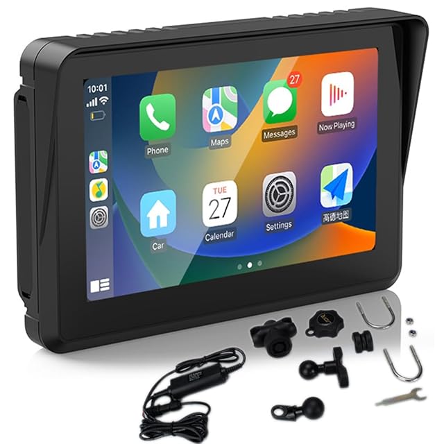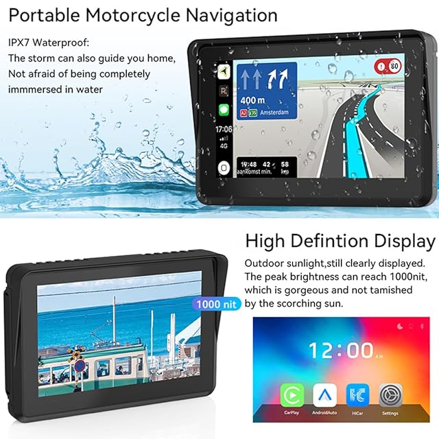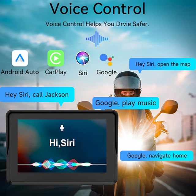 ポータブルワイヤレスCarplay & Android Autoオートバイナビゲーター用5インチIPSタッチスクリーン防水カーモニターモーターバイク用、内蔵スピーカー音声制御デュアルBluetoothヘッドセット12-24Vで動作