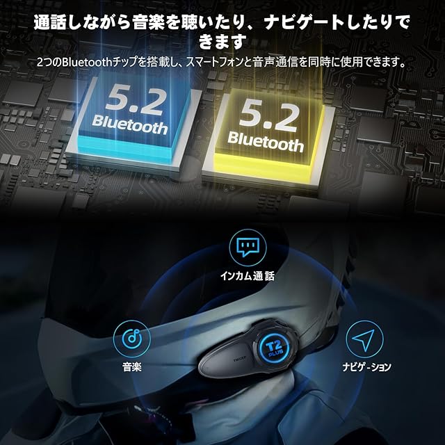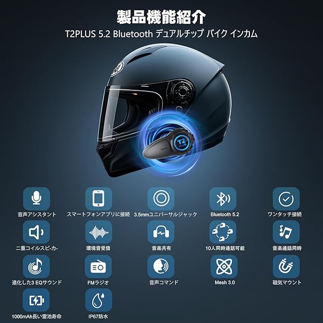 2025年アップグレード版 TNICER バイク インカム T2PLUS バイク用インカム 10人同時メッシュ通信可能 Bluetooth 5.2 デュアルチップ 音楽ながら通話 同時通話 1500m通信距離 専用アプリ ワンクリック自動接続 通信自動復帰 サブウーファー 音楽共有 FMラジオ 3.5mmカスタムスピーカー 磁気ベース IP67防水 他ブランドと接続可能 日本語音声案内 説明書
