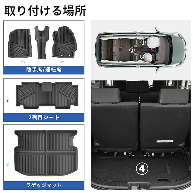 【車種専用設計・取付簡単】車種専用に設計されていることにより、車内に隙間なくフィットします。マットには固定用のストッパーホールが設置しておくので、車体の純正ストッパーでマットをフロアまで固定するだけで、ネジを使わずに、運転の安全性を高めました。商品を折り畳んだ状態で発送したため、折り目が付いた可能性がございます。到着後にお湯やドライヤーなどで暖めれば元の状態に戻ります。