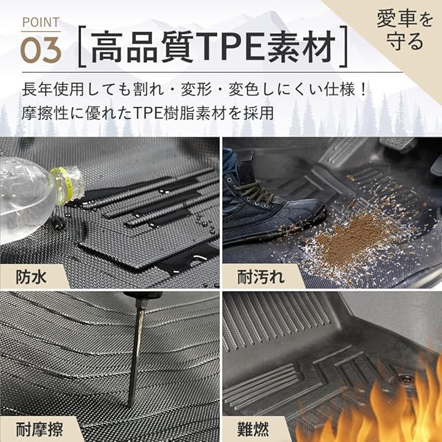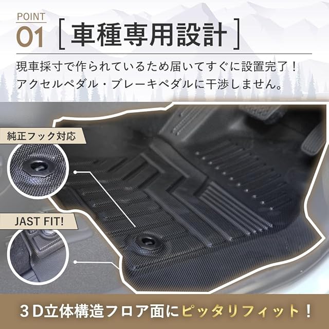 【完全車種専用設計】完全車種専用設計のため、車内に隙間なくフィットします。ズレのない抜群なフィッティング!アクセルペダルとブレーキペダルに干渉しません。耐候性に優れ、長時間使用しても表面劣化が起こりません。