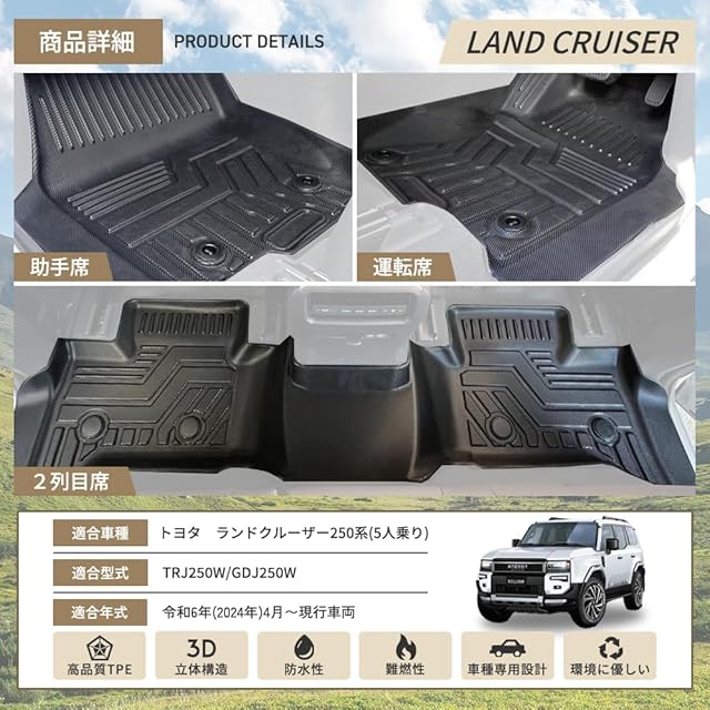 【適合車種】 LAND CRUISER 250/ランドクルーザー250 【適合型式】TRJ250W/ GDJ250 【セット内容】 運転席用1枚+助手席用1枚+2列目用1枚(合計3枚) 【適合年式】 2024年4月(令和6年4月)~ ※5人乗り専用のマットですが、7人用の1・2列目にも適合します。