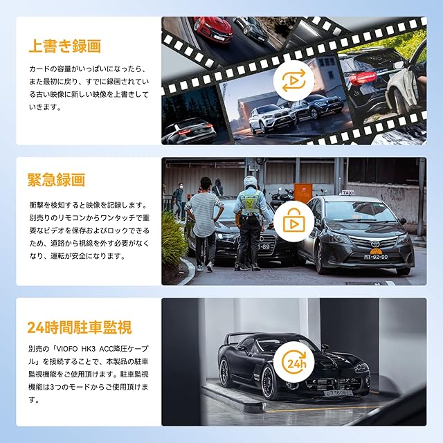 ✅【多機能対応】 A129PlusDuoはHDR夜間撮影、常時録画、Gセンサー、衝撃録画、駐車支援、ループ録画、音声録音など多くの機能に対応しています。さらに、3つの駐車監視機能を搭載しています。エンジンのON/OFFに連動して駐車監視モードへの切り替えが自動的に行われます。駐車監視中に動体を検知したり、衝撃を感知したりすると、自動的に録画を開始します。さらに、3つの録画モードが選択可能で、「動体検知+衝撃検知」、「タイムラプス(1/3/5/10FPS)+衝撃検知」、「低ビットレート録画」で常時録画+衝撃検知ビデオを低ビットレートで録画します。