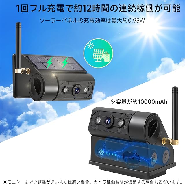 【車載カメラの稼働時間】トラック、クレーン、トラクターカメラであり、約12時間の連続稼働が可能となり、1日間のご使用においても電源切れの心配がありません。ご注意:気温やスピードやモニターまでの距離などによって、カメラの稼働時間が短縮する場合もございます。
