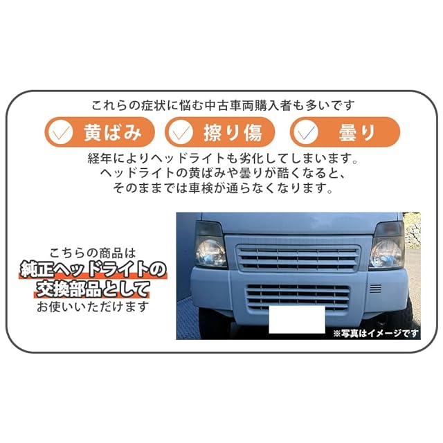 ヘッドライトの黄ばみや曇りが酷くなると、そのままでは車検が通らなくなります。高額な純正部品を用意して交換される方が多いと思いますが、純正互換品のリーズナブルな社外品でコストを抑える事が可能です。こちらの商品は純正ヘッドライトの交換部品として、カスタム素材用の部品としてお使いいただけます。