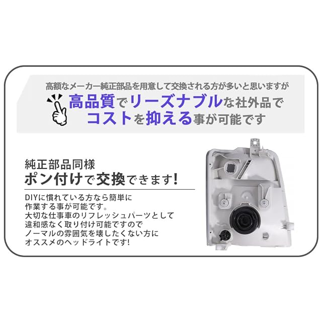 車種専用設計で純正部品同様ポン付けで交換できますので、DIYに慣れている方なら簡単に作業する事が可能です。大切な愛車のリフレッシュパーツとして違和感なく取り付け可能ですので、ノーマルの雰囲気を壊したくない方にオススメのヘッドライトです。※ライト類のバルブは付属しませんのでご注意ください。※年式により形状が違う場合がありますので、愛車のご確認をお願いいたします。