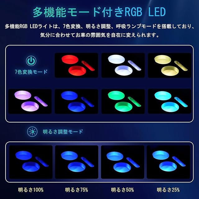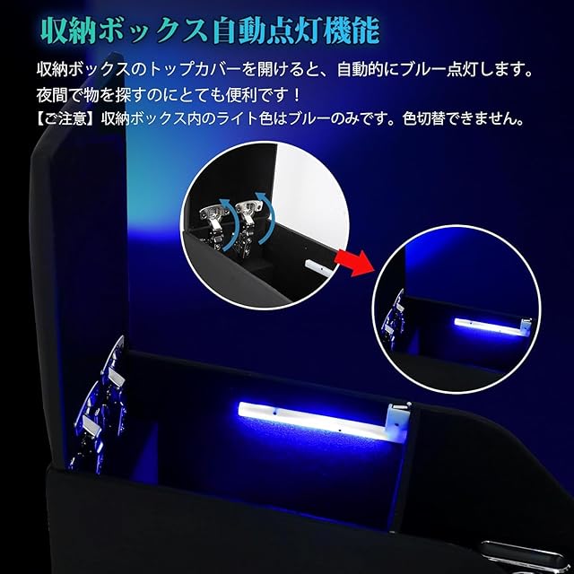 【RGB照明&直感的操作】ドリンクホルダー・スマホホルダー部分にカラフルなRGBライトを搭載。色はワンタッチで変更でき、グラデーション・消灯・記憶機能付き。夜間の物探しや、車中泊・高速SA休憩中にも便利。アームレストを開けると自動で青色ライトが点灯し、車内が見やすくなります。