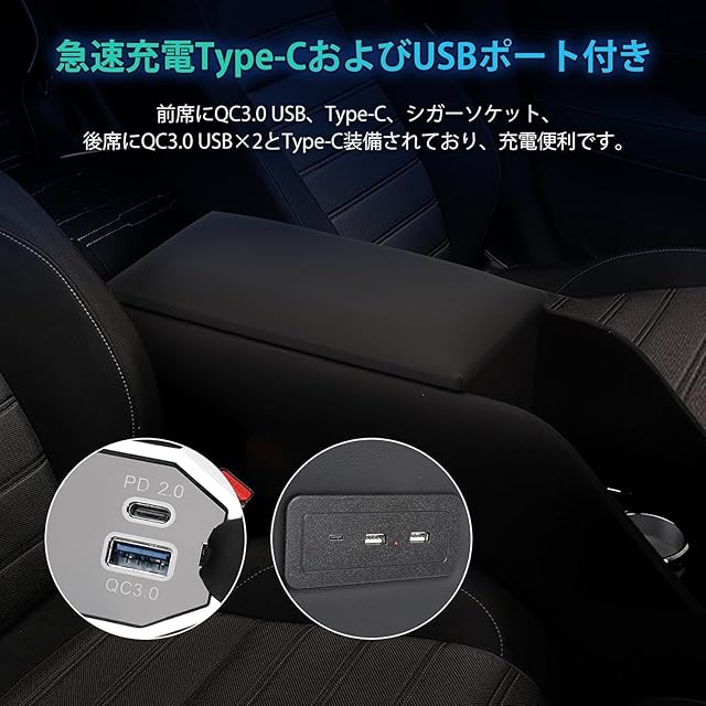 【急速充電対応 Type-C&QC3.0 USB】アームレストに設けられたType-CポートとQC3.0 USBポートにより、スマホ・タブレット・ポータブルゲーム機などの複数デバイスを同時に高速充電可能。車内で動画を楽しむ子どもとの長時間移動や、渋滞中のバッテリー切れ対策にも最適。