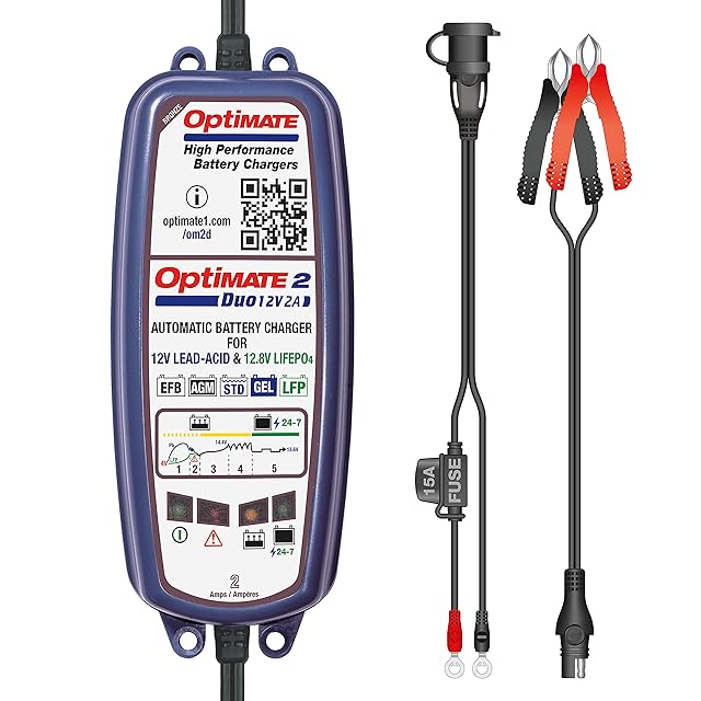 【テックメイト公式】OptiMATE充電器 オプティメイト2 DUO デュオ 12V2A 12V鉛+12.8Vリン酸鉄リチウム電池両用充電器。OE採用多数・超省エネ!バイク、車、ボート、ソーラー、RV車、産業用バッテリー用。12.8Vリチウム、鉛AGM・液式・EFB・スパイラルセル・ゲル電池用充電器 (1個単体)