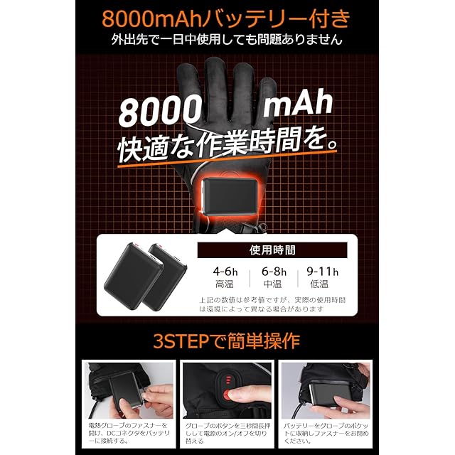 【2*8000mAh大容量バッテリー付き電熱グローブ】電熱グローブには2*8000mAhの充電式バッテリーが付属しており、発熱持続時間は最大約9-11時間、フル充電まで約4時間かかります。3Mシンサレート中綿を採用して、同厚のポリエステル綿と比べて、約1.5~2倍の保温力を持つ、保温、断熱効果は極めて高いです。