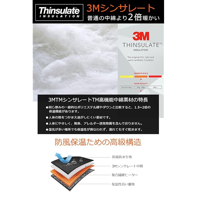 【3Mシンサレート中綿 & 複合繊維発熱糸】電熱グローブの中層材料は、3Mシンサレート中綿を採用し、厳選された原材料は、生地がより繊細で、より軽やかで、より良い保温効果を備えている。また、複合繊維の発熱糸は従来材料より柔軟性があり切れにくく、耐久性も2〜3倍強化されています。中わた素材による均一な伝導効果で手全体が温まります。
