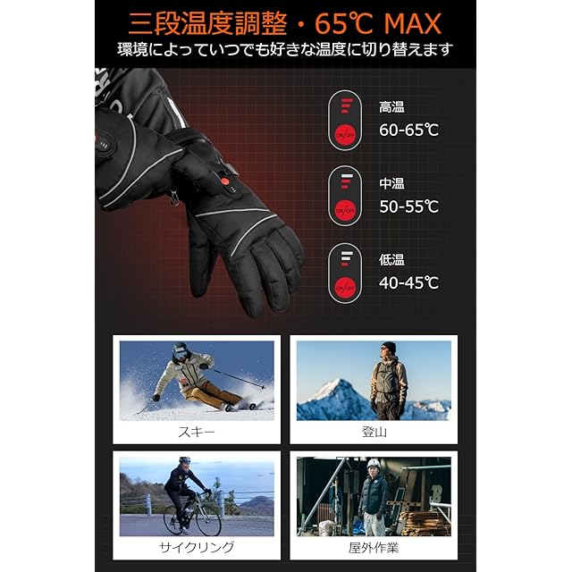 【三段階温度調節 & 65℃最高温度】より快適に寒い冬を過ごせますように、電熱グローブは低温・中温・高温の3段階の温度を調整することができます。電源ボタンを3秒間押し続け、発熱状態に入る:低温モード:40-45℃(約9-11時間);中温モード:50-55℃(約6-8時間);高温モード:60-65℃(約4-6時間)(上記の数値は参考値ですが、実際の使用時間は環境によって異なる場合があります。)。使用環境や自分の好みに合わせて適切な温度調整してください。