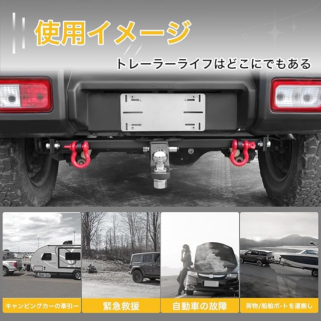 【最高な牵引力】は頑丈なアルミニウム合金、最大引張力は4500kgで、小型ジェットスキーやバイクなどの重量物の牽引に最適です。アウトドア派に愛される存在です。