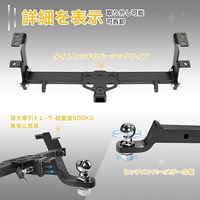 【アフターサービス】ヒッチメンバーの取り付けは穴あけをする必要がない、車を傷つけない同時に固定しやすいです。本製品には詳細なインストールビデオと紙版の取り付け説明書が付属しています。製品のインストールプロセスに役立つことを期待しています。何か質問やご要望がございましたら、お気軽にお問い合わせください。いつでもお客様のご意見をお待ちしております。