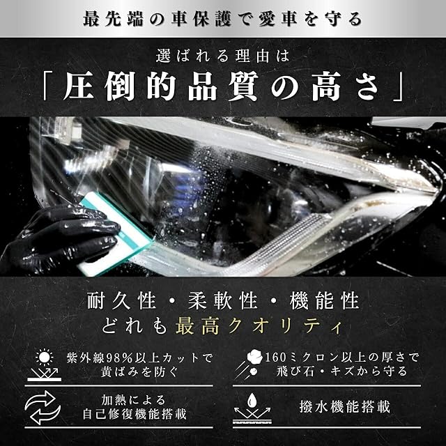 日本製高品質PPF:厚さ160ミクロン、紫外線カット率は98%以上、また撥水機能や自己修復機能も搭載されています。