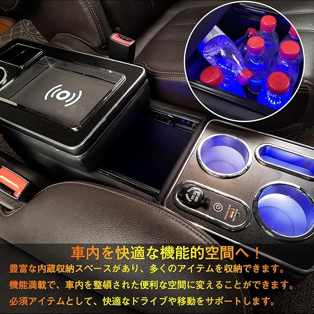 【カスタマイズ可能な照明】ドリンクホルダーと携帯ホルダーが搭載されており、ボタン一つでお好みの明るさにライトアップ可能です。日々の気分や環境に合わせて、明るさを自在に調整できます。車内の雰囲気や好みに合わせて光の演出が可能です。この照明機能により、ドライブがより快適で魅力的なものになります。