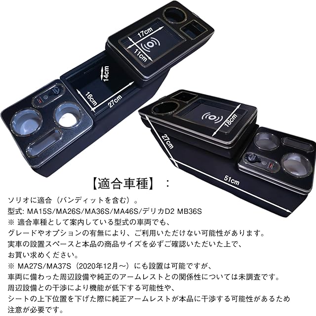 ※適合車種として案内している型式の車両でも、グレードやオプションの有無により、ご利用いただけない可能性があります。実車の設置スペースと本品の商品サイズを必ずご確認の上、お買い求めください。 ※MA27S / MA37S(2020年12月~)にも設置可能ですが、車両に備わった周辺設備や純正アームレストとの関係性については未調査です。周辺設備との干渉により機能が低下する可能性や、シートの上下位置を下げた際に純正アームレストが本品に干渉する可能性があるため、ご注意ください。