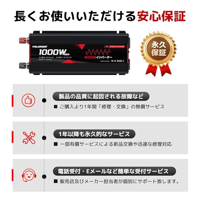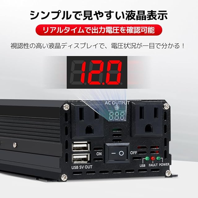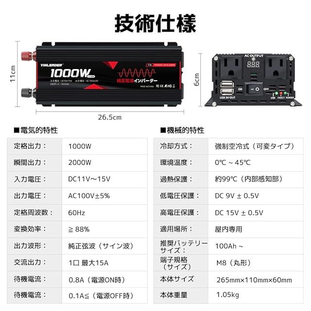 【製品仕様】 入力電圧:DC12V(11-15V±1V) 出力電圧:AC105V±5% 定格出力:1000W 瞬間出力:2000W 出力波形:純正弦波 変換効率:88% 周波数:60HZ
