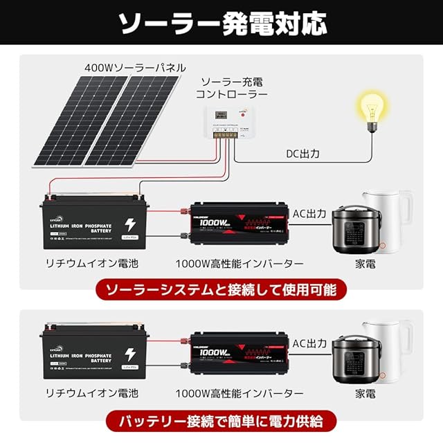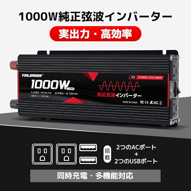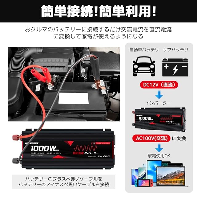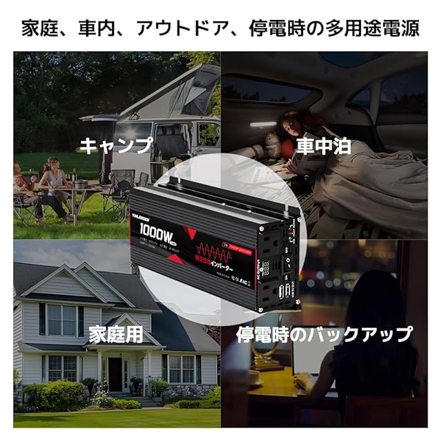 【2025年 新登場 パモデル!】 DC12VをAC100に変換 1000w「純正弦波(※サイン波)」の電力を供給して、家庭電源と同じように精密機器や電動工具など多くの電化製品をご使用頂けます。ノートパソコン、ラップトップ、ステレオ、テレビ、炊飯器、シェーバー、扇風機、ミニ冷蔵庫など、いつでもどこでも簡単に接続して使うことができます。